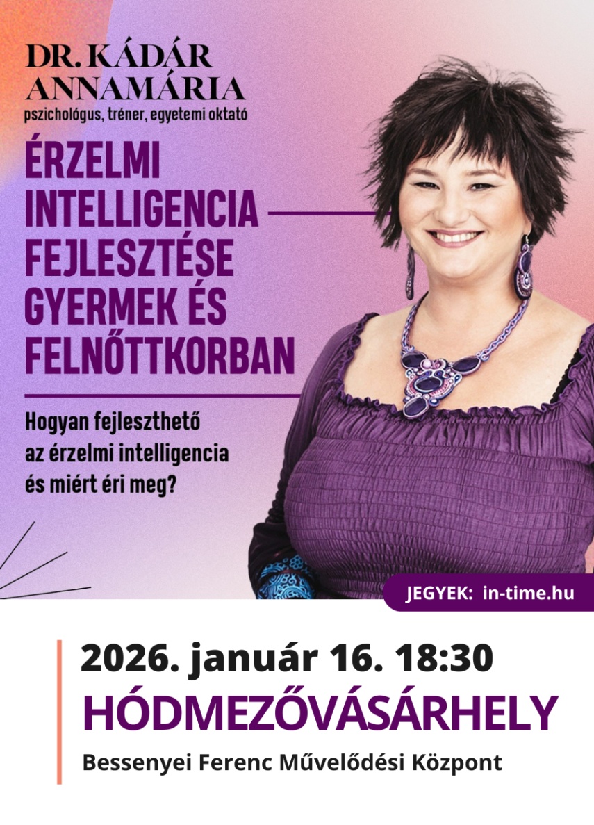 Dr. Kádár Annamária: Érzelmi intelligencia fejlesztése Gyermek- és Felnőtt korban - 2026. január 16. Jegyek kaphatóak a https://in-time.hu/e/erzelmi-intelligencia-fejlesztese-hodmezovasarhely-260116 oldalon. Érzelmi intelligencia: a siker és a kiegyensúlyozott élet kulcsa Miért van az, hogy egyes emberek könnyebben[...]