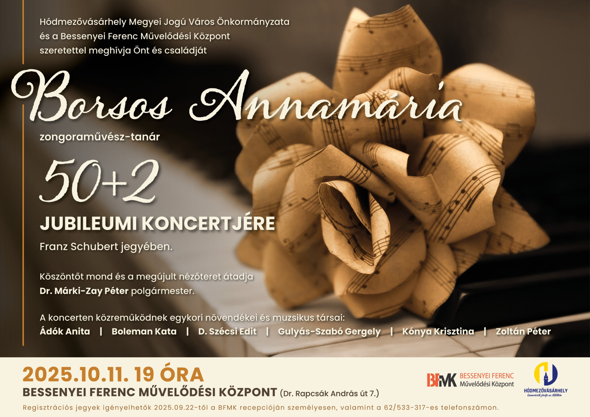 Hódmezővásárhely Megyei Jogú Város Önkormányzata és a Bessenyei Ferenc Művelődési Központ szeretettel meghívja Önt és családját Borsos Annamária zongoraművész-tanár 50+2 jubileumi koncertjére